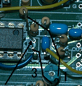 基板上の47kΩ上側に68kΩの片足を取り付けてあけた穴から裏に回し半固定1番端子へ、