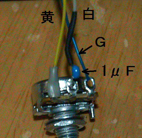 a黄 B白のリード線を出し追加した穴から表のVRにつなぎます、白は1μFのコンデンサー